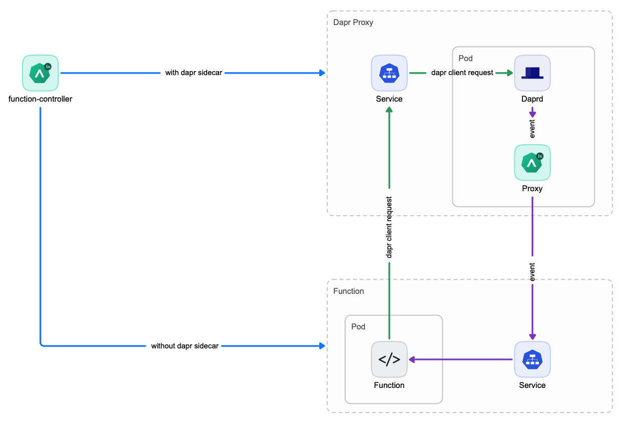 openfunction.io/enable-dapris set tofalse, the value ofopenfunction.io/dapr-service-modewill be ignored and neitherDapr SidecarnorDapr Proxy Servicewill be launched.